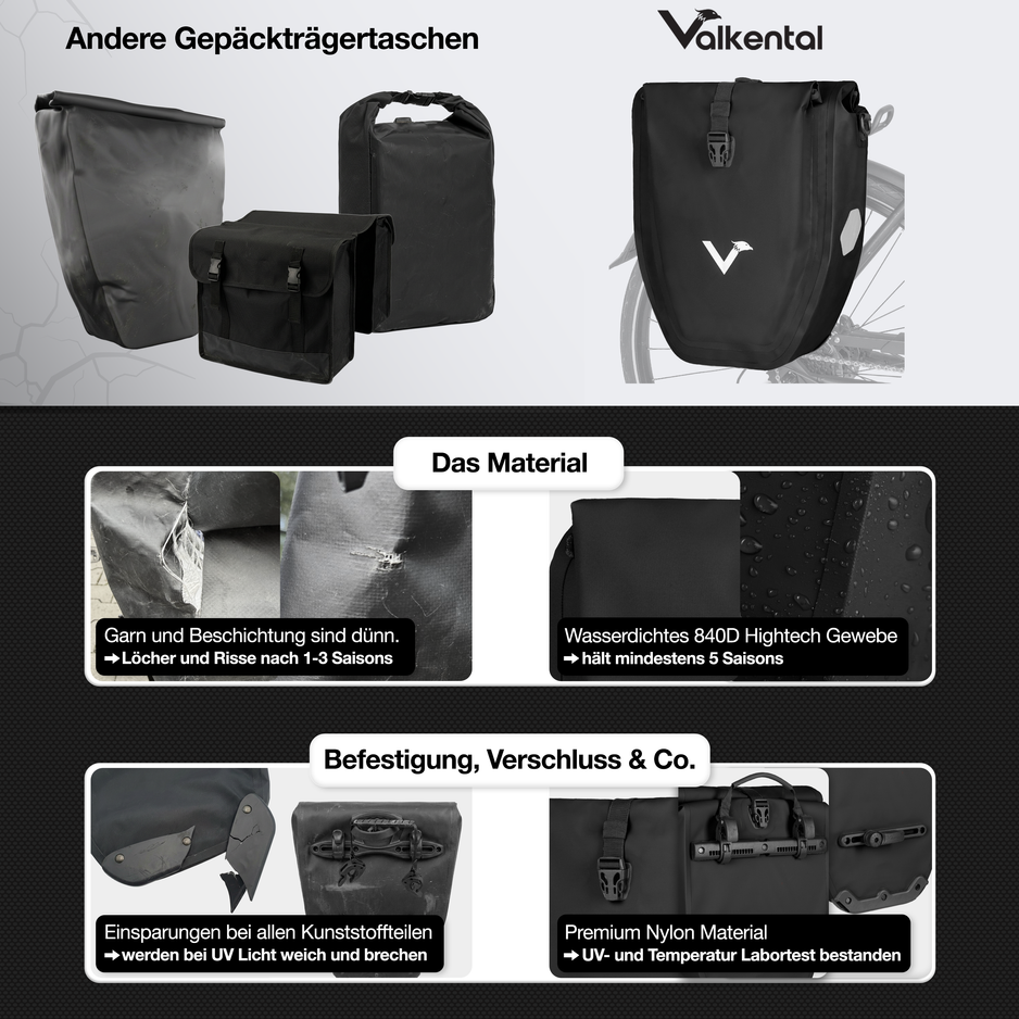 Als je echter maar af en toe met de fiets onderweg bent en maar een kleine hoeveelheid bagage hoeft mee te nemen, kan een kleiner model zoals een bagagetas volstaan. Welke fietstas je ook kiest, waterbestendigheid is het allerbelangrijkste. Valkental fietstassen bieden je maximale bescherming tegen water en een afwerkingskwaliteit van de sluiting tot het bevestigingssysteem waar je elke dag plezier van hebt.
