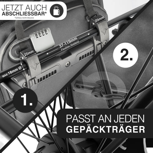 Onze multifunctionele tassen passen perfect op 98% van de bagagedragers. Alleen wie een zeer speciale bagagedrager met e-bike-accu of bijzonder dikke steunen heeft, moet de afmetingen nogmaals vergelijken met die op productafbeelding 3.