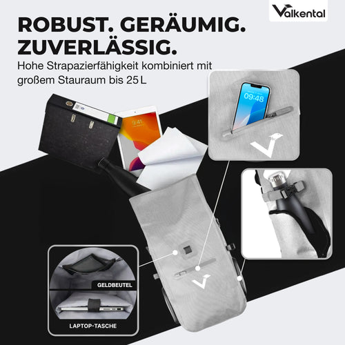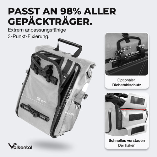 Maak je dagelijkse leven gemakkelijker! Met de ValkPro combinatietas heb je niet alleen een milieuvriendelijke manier om je spullen door de stad te vervoeren, maar heb je ook beide handen vrij. Voor meer comfort op de fiets en meer flexibiliteit op je bestemming staat VALKENTAL aan je zijde. Met de ValkPro heb je voor elke situatie de juiste tas.